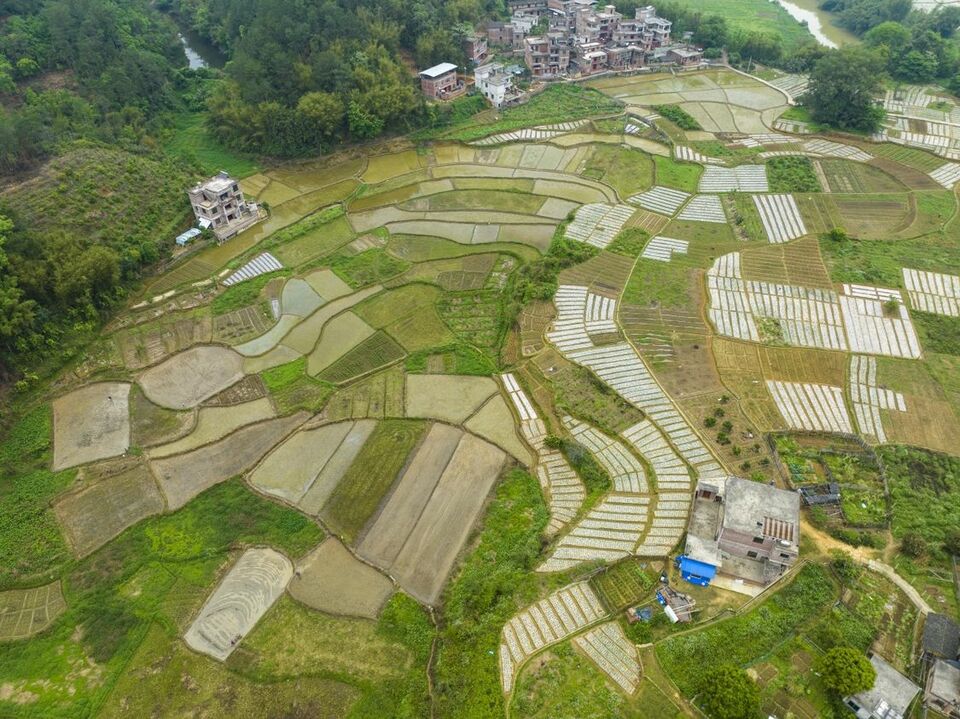 4月9日,梧州市蒼梧縣京南鎮武嶺村阡陌田園與村莊、公路、小溪、青山相映成趣,宛如大地調色板,構成一幅如詩如畫的春日鄉村畫卷。通訊員 何華文 攝
