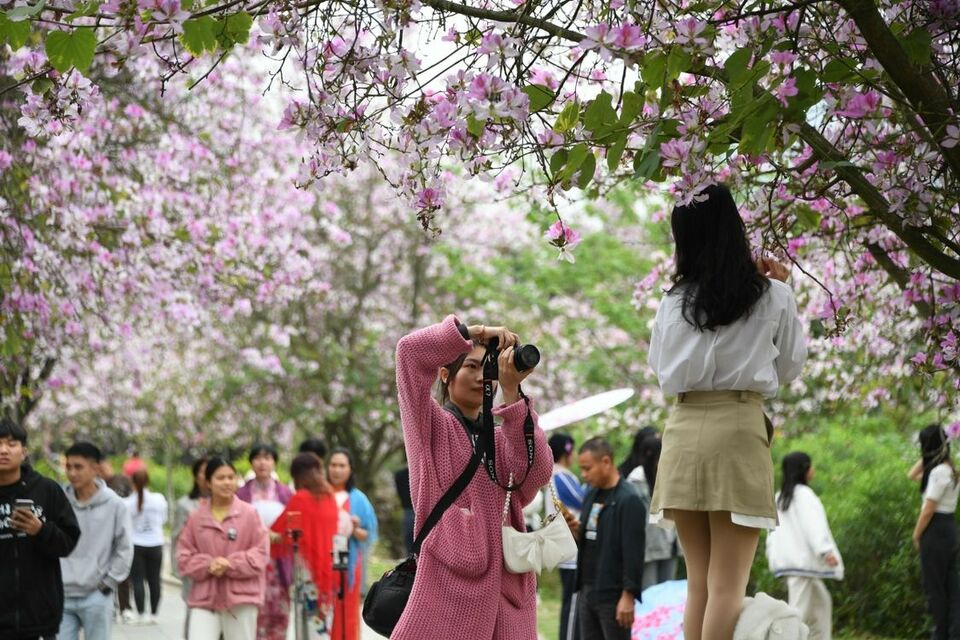 4月9日,隨著氣溫的回升,羅城仫佬族自治縣成龍湖公園紫荊花盛開,吸引眾多遊客前來觀賞、拍攝。通訊員 韋如代 攝