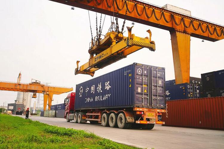 貿易便利化水準的提升助力中越班列運量增長勢頭強勁。圖為在南寧國際鐵路港,中越跨境集裝箱等待吊裝作業。(陳星宇 攝)