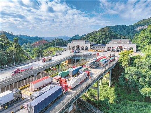 11月21日,在憑祥友誼關口岸,由中國前往越南的貨車在關口前排起了長隊。該口岸是中國通往東盟最便捷的陸路大通道之一。據友誼關海關統計,今年截至10月,經該口岸進出口總值達4950.5億元,同比增長30.9%,佔廣西各口岸進出口總值的39.7%,居廣西口岸首位。(廣西雲-廣西日報記者遊擁軍/攝)
