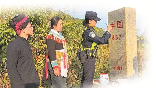 民警和群眾一起為界碑描紅。 莫禮亮/攝