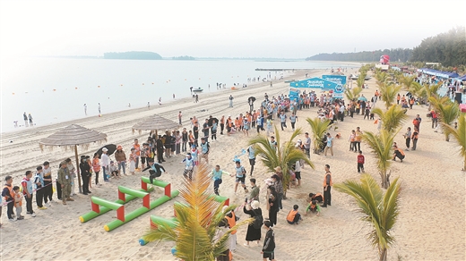 2月7日,欽州市欽南區犀麗灣景區暖陽和煦,木麻黃樹影搖曳,海面上摩托艇飛馳……一場以“尋味欽州鮮·潮聚多彩犀麗灣”為主題的新春促消費活動在此火熱開展。活動整合濱海旅遊、民俗體驗、年貨展銷、體育賽事等多元場景,推出“海景窯”、沙灘燒烤、沙灘障礙挑戰賽、年貨一條街等特色項目,單日吸引遊客6.2萬餘人次,帶動旅遊綜合收入6838.6萬元,為新春消費市場注入強勁動能。
