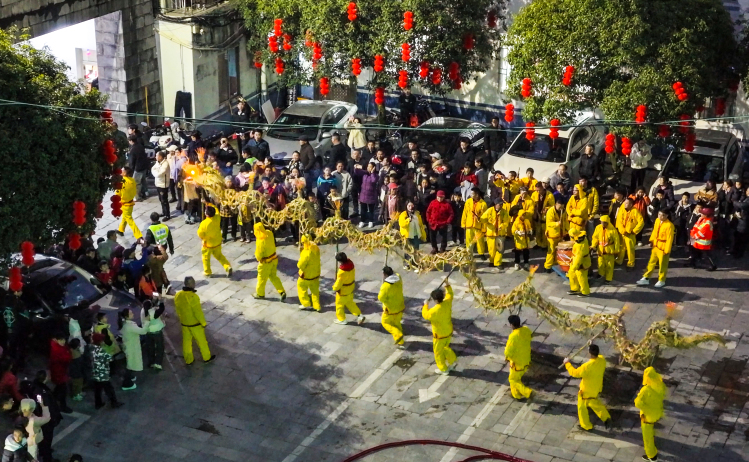 夜幕降臨,古鎮紅燈籠沿漓江綿延千米,與喀斯特峰巒相映成景。晚上7時許,鑼鼓聲起,草龍巡遊啟幕。數十名壯漢身著彩服高舉龍桿,草龍時而昂首擺尾、時而盤旋戲珠,稻草清香與節日氣息交織。