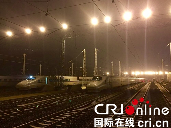 貴陽北動車所夜色中的動車組。(攝影 楊雲)