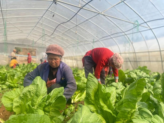 在龍場鎮開嘎村的蔬菜大棚內,放眼望去滿目碧綠,年前種下去的青菜迎來豐收。村民們正搶抓農時采收,並及時碼放整齊,等待冷鏈車上門收購配送。