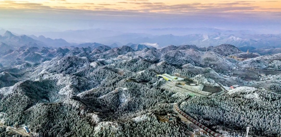 1月29日清晨,位於貴州省六盤水市鍾山區的梅花山旅遊景區雪後初晴,紅裝素裹,美不勝收。