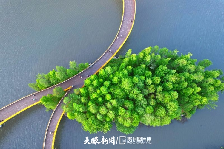 六盤水市鍾山區明湖國家濕地公園美如畫,市民在橋上散步。王近松 攝