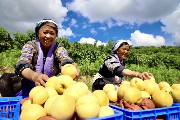 在貴定縣德新鎮海拔1300多米的高山上,4000多畝黃桃果香四溢,金黃的果實飽滿誘人。在廣東省廣州市海珠區資金、技術、市場等方面支持下,當地已建成6個200畝以上的規模化種植基地。今年預計黃桃産量可達100萬公斤,成為當地群眾增收的“黃金果”。