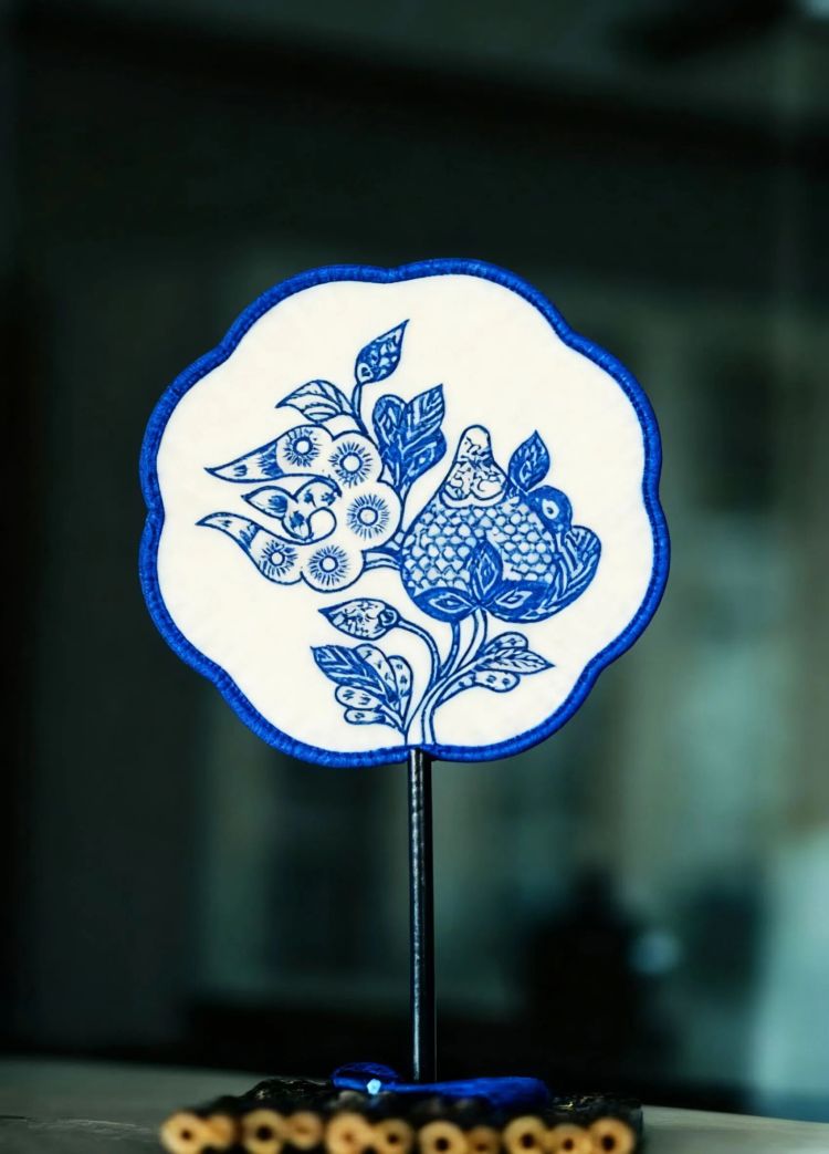 《民族風鏤空繡團扇》上繡有石榴圖案,承載著彝族人民對美好生活的嚮往和祝福。石榴果實籽粒繁多,在彝族文化裏象徵著多子多福,作品上的石榴圖案象徵著彝族同胞對家族繁榮的期盼。