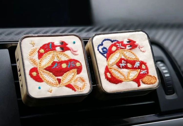 《手工刺繡車載香薰》以苗族“蝴蝶媽媽”文化符號與蛇年專屬吉祥紋樣為設計核心,巧妙運用挑紗、和平繡、盤金繡三種傳統技法打造外觀;香氣上從色彩視角出發,融入艾草、薰衣草等源自大地的植物芬芳,既實現視覺與嗅覺的和諧統一,又發揮醒目提神的功效。