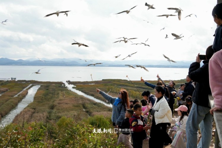11月11日,遊客在草海國家級自然保護區觀賞投喂紅嘴鷗。