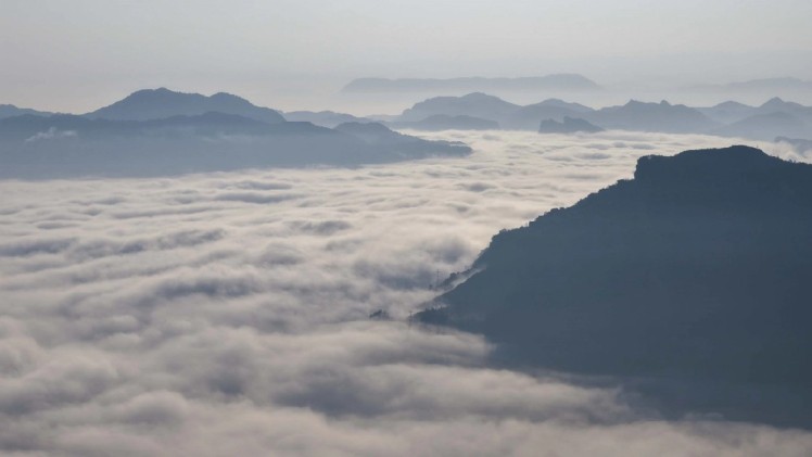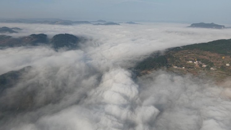 11月16日,貴州省黔東南州重安江上空出現壯麗的雲海景觀。尤為奇特的是,翻滾的雲海順著地勢,在兩個不同高度的山谷間傾瀉而下,形成了一道氣勢恢宏的“雲海瀑布”。白色的雲瀑與墨色的山巒交相輝映,宛如一幅流動的山水畫卷,令人嘆為觀止。(貴州日報天眼新聞記者 廖文祥)