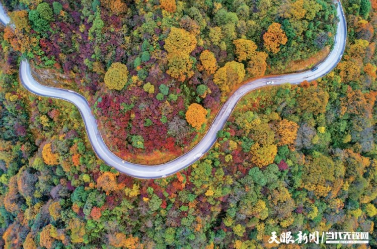 從高空俯瞰,大地仿佛鋪開了一幅巨大的織錦,紅、黃、綠相間的樹木交織點綴山間,宛如大自然打翻的調色盤。成片的青岡樹葉猶如錦緞,紅色、黃色、青色、藍色和紫色,調配出豐富色彩,染盡層林。