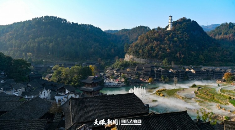 清晨,薄霧漫過寨河,吊腳樓的輪廓在朦朧中若隱若現,陽光穿透雲層灑在水面,波光粼粼與古寨的吊腳樓相映,成為遊客拍照打卡的熱門場景。遊客沿著青石板路漫步,或乘烏篷船遊覽寨河,沉浸式感受古寨的冬日韻味。