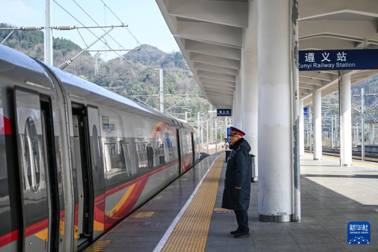 1月26日,貴州遵義開往延安方向的G3360次列車停靠在遵義站站臺。新華社記者 楊文斌 攝