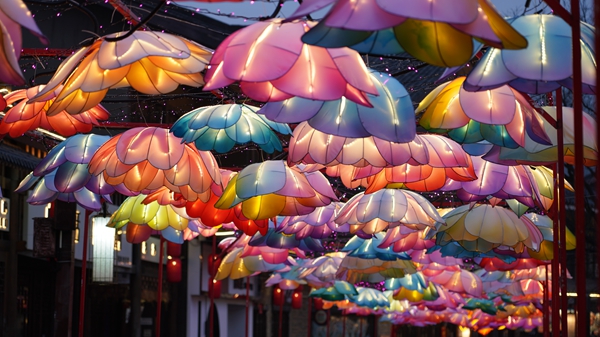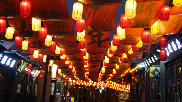 丹寨萬達小鎮景區內遊人如織,數千盞非遺花燈次第亮起,流光溢彩鋪滿街巷。從傳統宮燈到生肖綵燈,從苗族圖騰造型到現代光影裝置,傳統圖騰與現代光影交相輝映,現場遊客紛紛拿出手機記錄美景,古街瞬間化作光影的海洋。“今天我看見了我們的非遺傳承打鐵花,就像灑落的星辰一樣,美麗極了。”丹寨市民楊斯涵説。