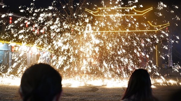 除了絢麗的花燈,非遺打鐵花表演更是將現場氛圍推向高潮。夜幕之下,匠人師傅們將熾熱的鐵水奮力拋灑,瞬間,萬千火星騰空而起,如流星劃過天際,似煙花綻放夜空,鐵花飛濺處,金光閃閃,氣勢磅薄。鐵水墜落時,又化作漫天星火,絢麗奪目,引得現場觀眾陣陣驚呼,掌聲、喝彩聲不絕於耳。