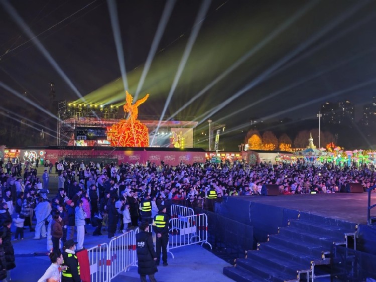 圖為2月11日,貴陽觀山湖公園民族大聯歡廣場燈火璀璨,人潮如織。民族歌舞、非遺絕技、高空威亞等多種表演形態在夜色中輪番登場。(貴州日報天眼新聞記者 楊濤)