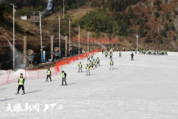 六盤水梅花山國際滑雪場的滑雪教練正在進行滑雪技巧展示,盡享冰雪樂趣。郭海君 攝(影像貴州)