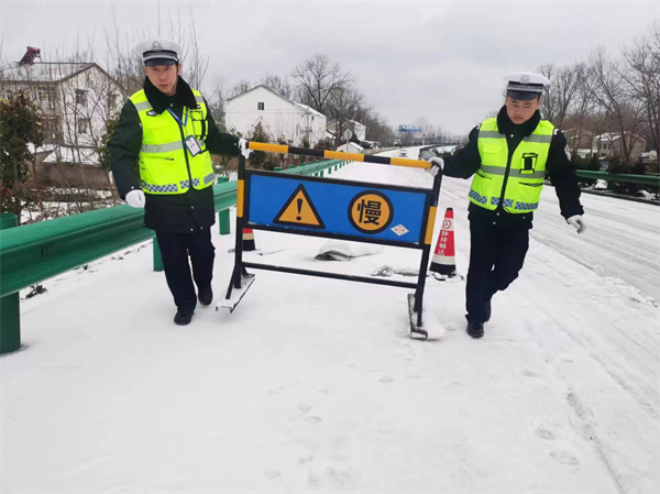 因道路結冰,荊門交警在轄區重點路段實施交通管制