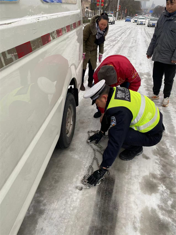 荊門交警及時服務、救援受困群眾,幫助車輛安裝防滑鏈