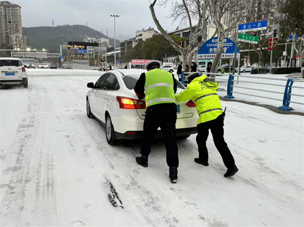 線下,荊門交警對轄區重點路段實施交通管制,聯合路政、城管部門開展融雪、鏟冰工作,共戰寒潮,對出行群眾提供服務和幫助。(圖/文 談媛媛)