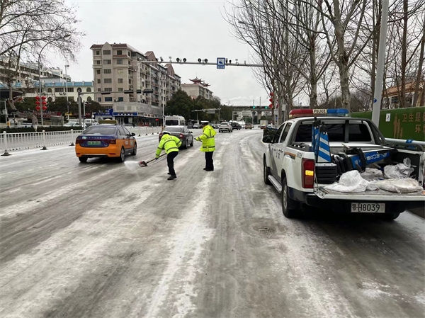 荊門交警聯合路政、城管部門開展撒鹽融雪、鏟雪除冰工作