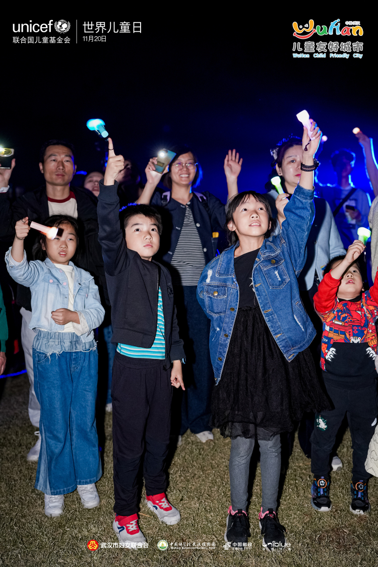 夜幕降臨,所有人都圍聚在星光森林周圍,打開手機、打開手電筒,共同揮舞,如同萬千星光。倒計時結束,孩子們一起大喊:“點亮武漢!點亮未來!”,全場的燈光瞬間被點亮,藍色的燈光透過成千上萬個塑膠瓶發生柔和的折射,整個“WUHAN”符號變得通透、璀璨、光芒四射,象徵兒童夢想點亮城市未來;瓶中的字條在光線的映照下,形成斑駁的陰影,仿佛那些夢想和承諾在光芒中飛舞,讓世界看見未來的模樣。儀式上,全體參與者共同宣讀了《給未來的環保誓言》。隨後,所有寫滿期許的信件被鄭重存入特製的時間膠囊內封存,相約至2035年11月20日開啟,以此見證時光流轉中夢想的成長與城市的變遷。