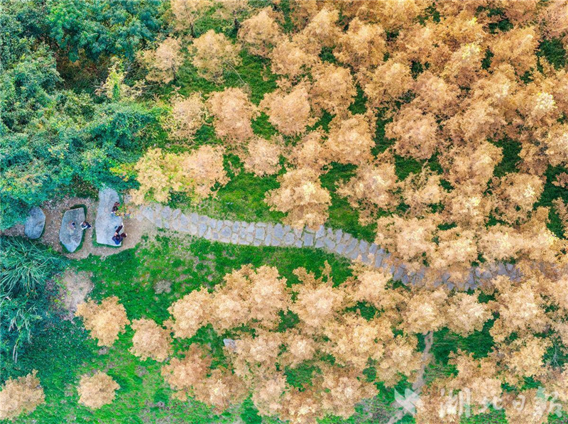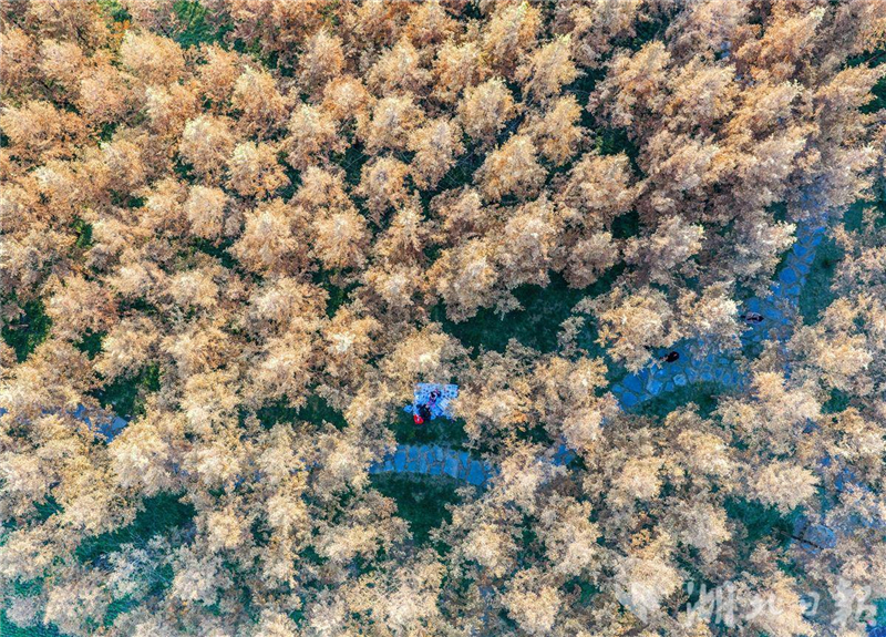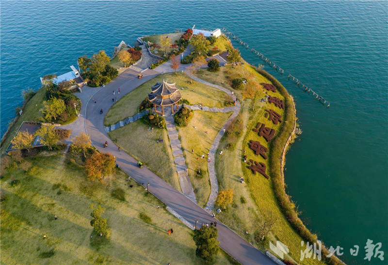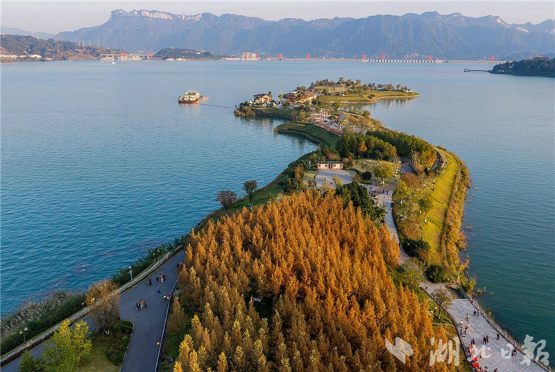 11月23日,遊人在三峽大壩上游附近的木魚島公園休閒遊玩。初冬時節,秭歸縣峽江兩岸生態屏障層林盡染,色彩斑斕,景美如畫。(視界網 王罡 攝)
