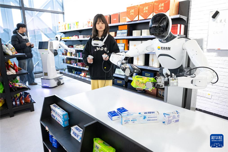 12月4日,在湖北人形機器人創新中心,數據採集員操作人形機器人進行超市場景的數據採集。新華社記者 肖藝九 攝