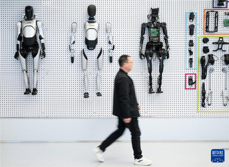 12月4日,在湖北人形機器人創新中心展示廳,參觀者從機器人群中走過。新華社記者 肖藝九 攝