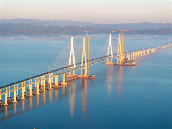作為寧波至象山市域鐵路的控制性工程,象山港跨海大橋連接寧波鄞州區與象山縣,全長約8.276公里,其中跨海段橋梁長6.24公里,設計時速160公里,與既有甬莞高速橋僅相隔50米,兩橋比肩而立形成獨特的“跨海雙廊”景觀。大橋建成後將創下“國內首座市域(郊)鐵路跨海大橋”“國內並行既有線最大跨徑橋梁”及“最大跨度無砟軌道鋼箱梁斜拉橋”等多項紀錄。