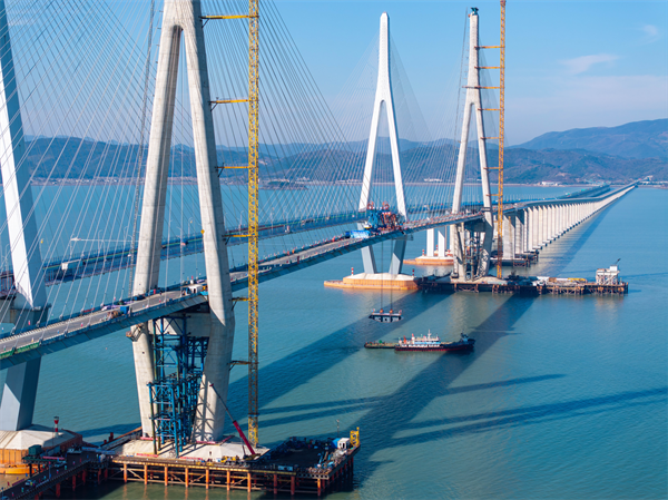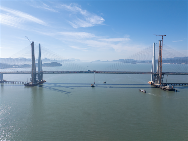 大橋為主跨688米的組合式鋼箱梁斜拉橋,由95個節段鋼箱梁和88對斜拉索組成筋骨。施工中,鋼箱梁架設是核心難點之一,建設團隊採用4台橋面吊機、從兩主墩同步對稱架設的方法,歷經7個月的夜以繼日,終於迎來主橋順利合龍。