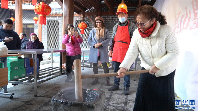 除了宴席上的美味,現場的民俗體驗也頗具特色。現磨豆漿的醇厚豆香隨石磨轉動緩緩彌散,手作印花粑粑的捶打聲裏藏著代代相傳的巧思與溫度。