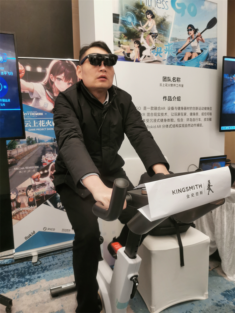 參展觀眾在體驗一款融合AR設備與健身器材的運動健身應用 攝影 胡禮國