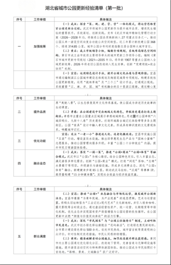 湖北省住建廳發佈湖北省城市公園更新經驗清單(第一批)。此次發佈的經驗清單從加強統籌、提升品質、優化功能、融合業態、群眾滿意五個維度,梳理了武漢、黃石、宜昌、孝感、黃岡等地的創新實踐與具體舉措,為城市公園更新工作打造了可複製、可推廣的湖北方案。