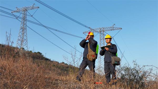 國網黃石供電公司輸電運維工陳睿(中)和同事們在巡線現場 供圖 國網黃石供電公司