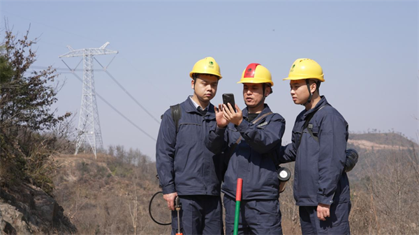 國網黃石供電公司輸電運維工陳睿(中)和嚴宇豪(右)和余朝華(左)通過輸電線路導航軟體查看路線 供圖 國網黃石供電公司