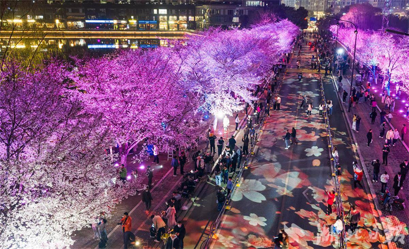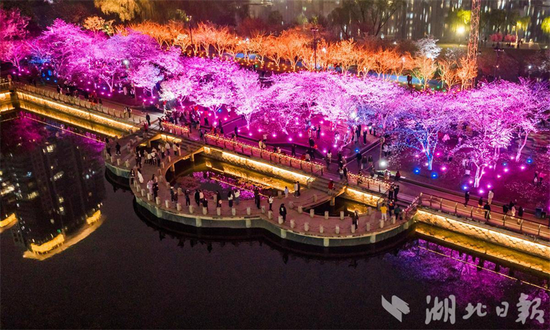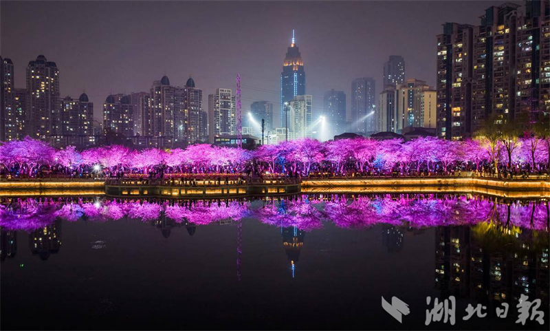 3月24日,武漢西北湖公園夜櫻璀璨,花瓣在變換的燈光中顯得分外妖嬈,眾多遊客穿梭其中打卡拍照。眼下,武漢櫻花進入盛花期,武漢夜櫻在社交平臺上火爆出圈,吸引各地遊客組團打卡,感受武漢春天的浪漫。(湖北日報全媒記者 薛婷 攝)