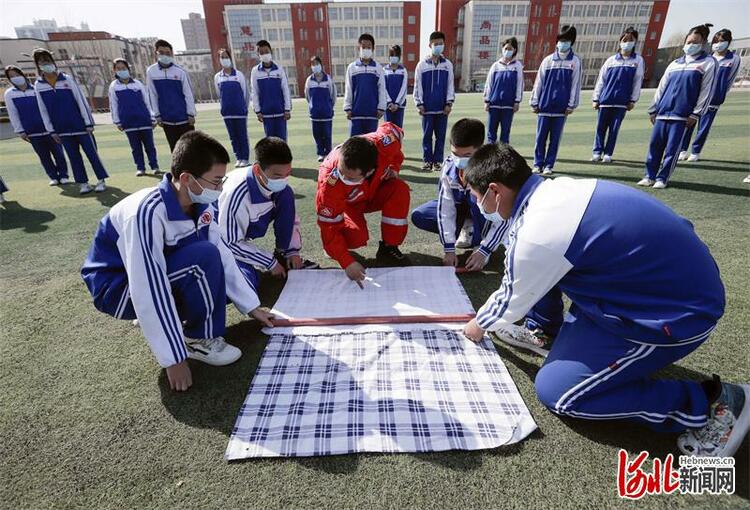 公益救援志願者在河北省遵化市第三中學輔導學生綁扎簡易急救擔架。