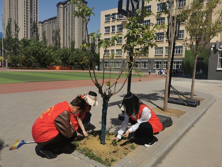 活動中,教師們清掃校園、除草護綠,使每棵樹木都能更好地吸收養料、茁壯成長。