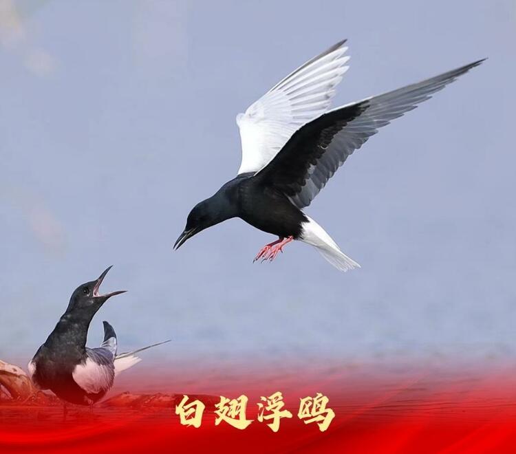 白翅浮鷗,兩翼及尾部灰白色,頭頸呈黑色,主要棲息于內陸河流、湖泊等水域,常成群活動。