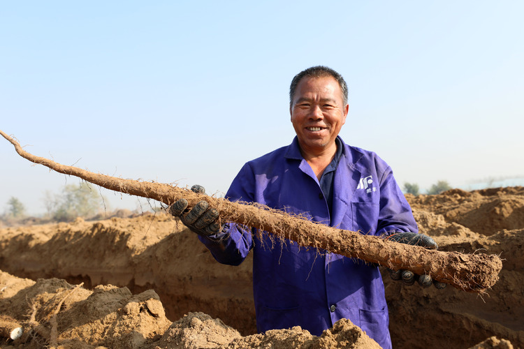 在隆堯縣魏家莊鎮李賈村麻山藥種植基地,農民展示收穫的麻山藥 攝影 潘志芳