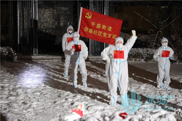 “團結就是力量,這力量是鐵,這力量是鋼……”國旗飄飄、紅歌唱響。11月10日晚,平盛街道碧桂園社區臨時黨支部組織部分黨員、志願者及碧桂園小區防疫一線人員,在碧桂園園區一處空地,頂著風雪舉辦了以“同心抗疫不放棄”為主題的演出活動,給隔離在家的居民加油、打氣,“勝利就在不遠的前方,不到最後一刻決不放棄”。