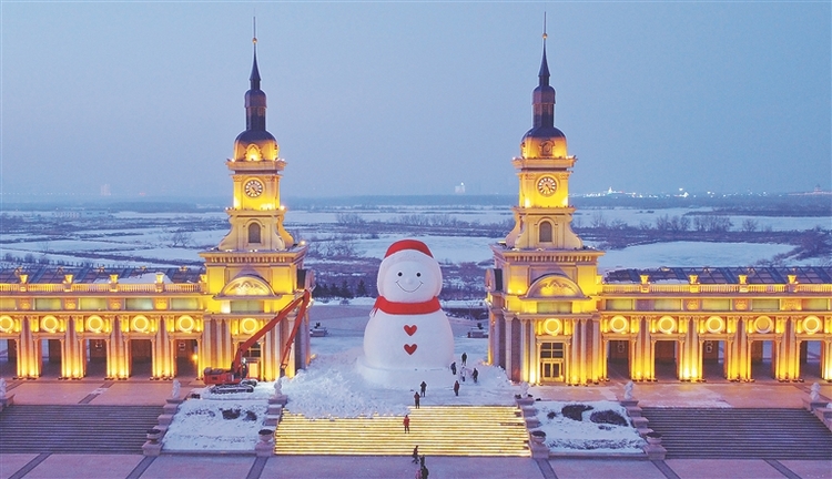 近日,在哈爾濱市道裏區友誼西路群力音樂公園,遠遠的就能看到一個頭戴大紅帽、圍著紅圍巾、胸口有兩個大大紅心、嘴角上揚的巨型雪人。