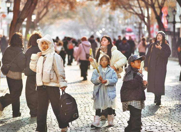 11月12日,哈爾濱市道裏區中央大街、松花江畔,許多南方孩子在家長的帶領下觀光遊玩,品嘗美食。