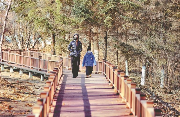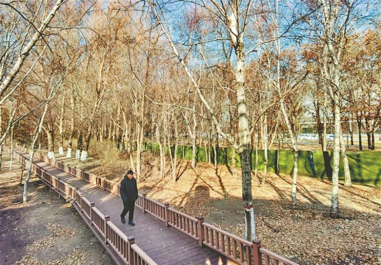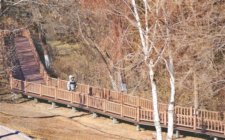 曲折蜿蜒的棧道穿過一片松樹林和白樺林,景色很美。靠近地鐵站一側設有休閒座椅和觀景平臺,方便人們休息、賞景。(記者 蘇強攝)