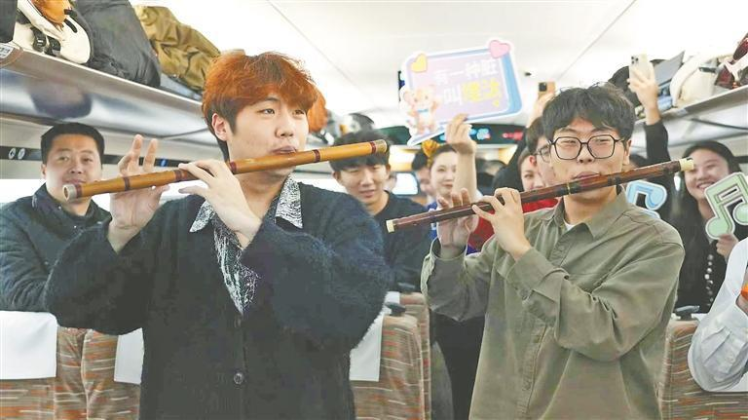 近日,在北京朝陽開往哈爾濱西的G917次動車組列車上,來自哈爾濱音樂學院的青年民族樂團用二胡、笛子、嗩吶等民族樂器與列車工作人員共同演繹《我愛你,塞北的雪》等經典曲目,為龍江冰雪季增添文化色彩。