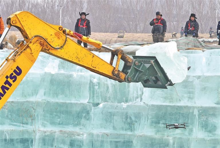 據了解,當下松花江仍沒有封凍,存冰的順利啟用可以讓園區提前開始冰建建設。隨著存冰入場,近萬名冰建工人陸續投身景觀建設,一個全新的夢幻童話世界將在120萬平方米的園區“夢想成真”。(記者 張澍攝)