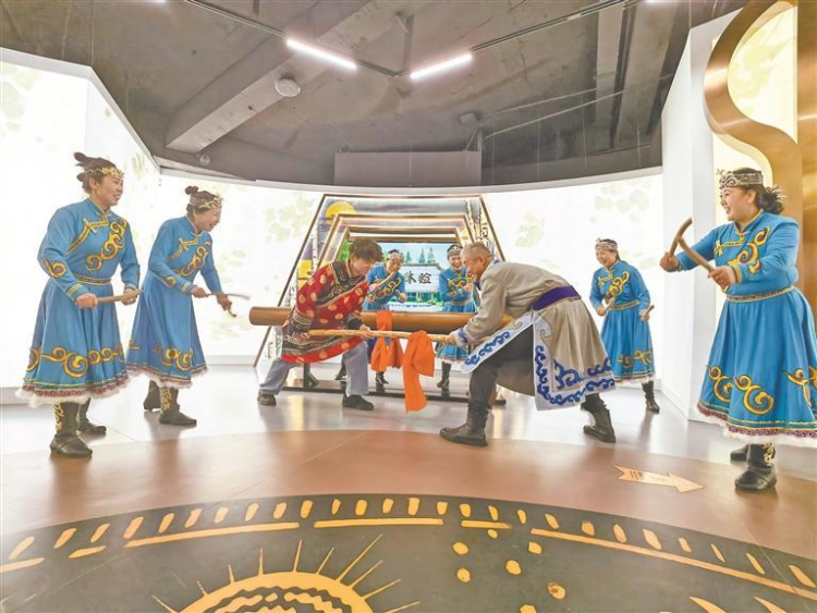 走進這座5000平方米的體驗館,仿佛踏入了一條時光長廊。現代科技的光芒照亮了古老的赫哲文明,多媒體光影交織間,漁歌與史詩穿越時空,與今人對話。序廳“時光通道”裏,光影流轉,將人們帶入赫哲族的創世傳説;七個單元層層遞進——“恩都力創世”“赫哲誕生”“萬物有靈”“鱘鰉之巔”“伊瑪堪傳唱”“四季漁歌”“赫哲非遺”,每一處都是一場視覺與心靈的震撼。